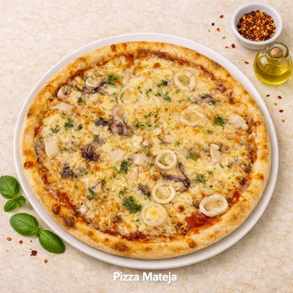 Testo, pelati, sir, lignji, tržaška omaka, oliva