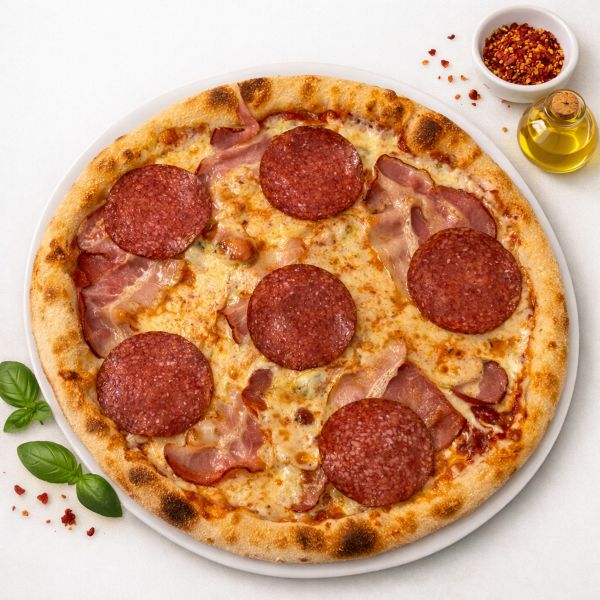 Testo, pelati, sir, slanina, kranjska klobasa, salama, oliva