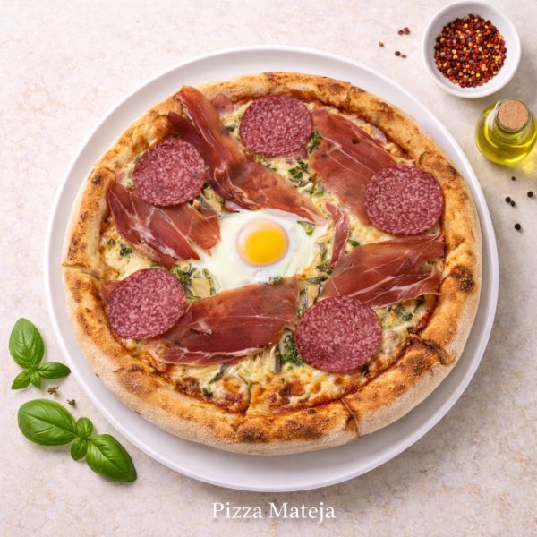 Testo, pelati, sir, šunka, suha salama, hrenovka, pršut, šampinjoni, jajce, tržaška omaka, oliva
