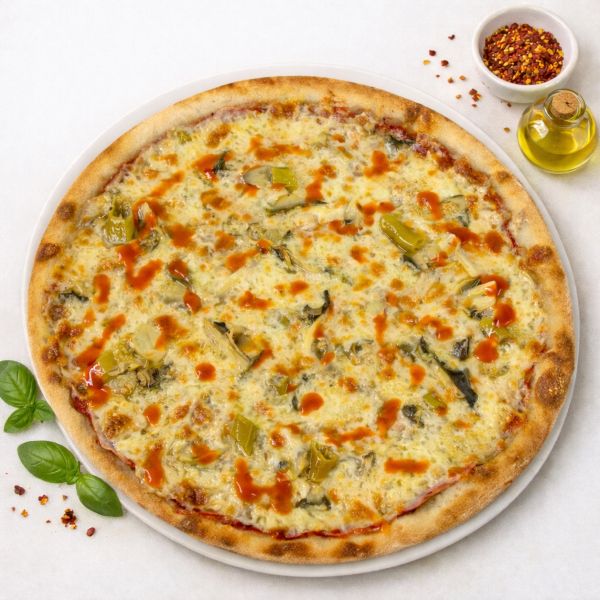 Testo, pelati, šunka, sir, šampinjoni, česen, pekoči feferoni, tabasko
