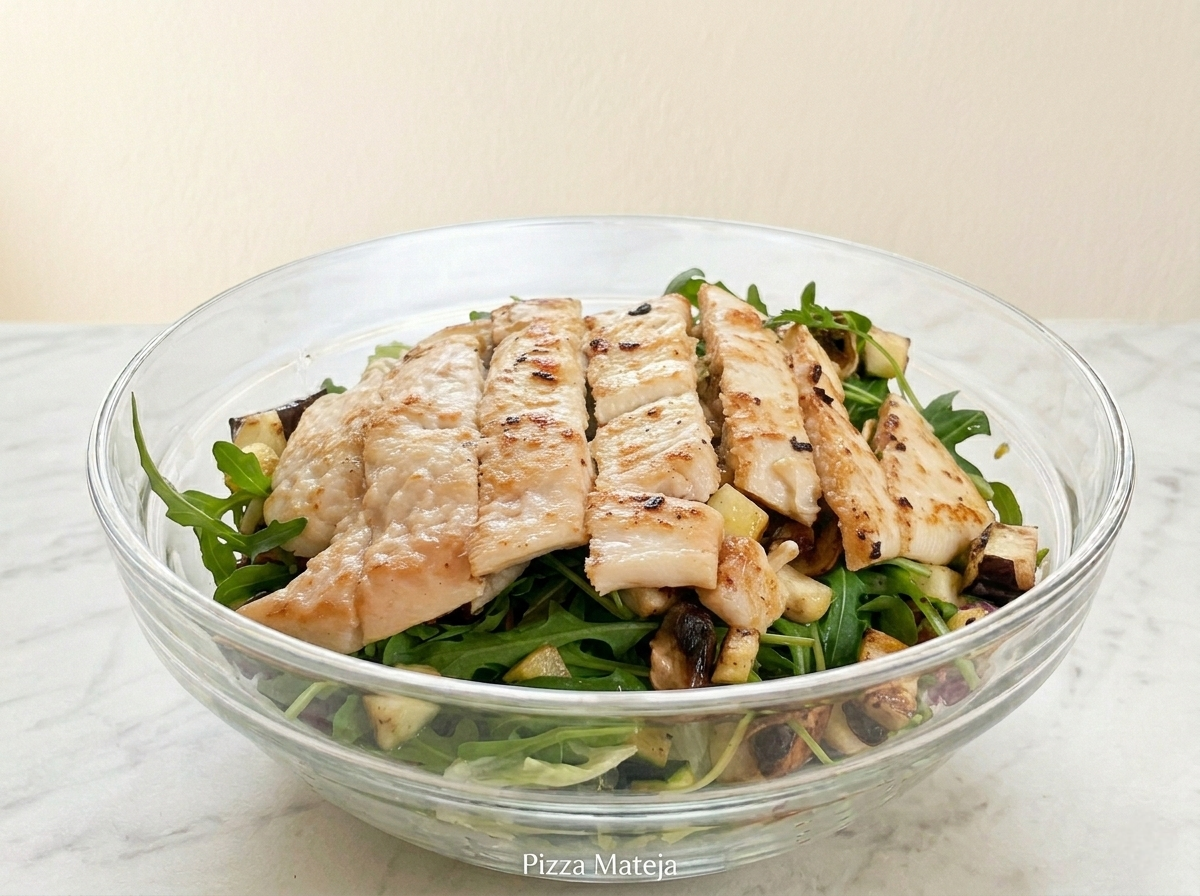 Zelena solata, radič, rukola, bučke, gobe, malancani, zrezek na žaru – priporočamo majonezni preliv